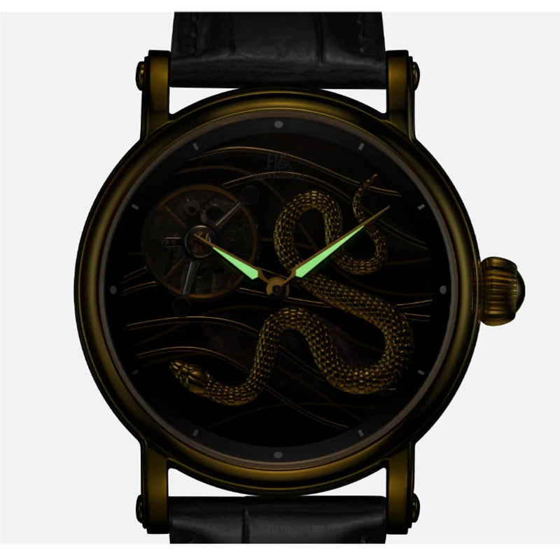 Its numberless dial, protected by a synthetic sapphire crystal, offers a modern, minimalist aesthetic, while the golden snake motif pays tribute to Chinese heritage with bold elegance. The 34-jewel K01 movement, beating at 21,600 vibrations per hour, delivers precision and mechanical beauty through manual winding.
