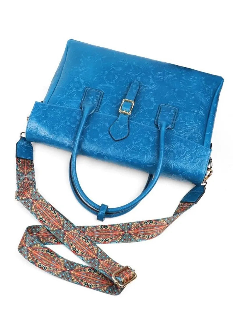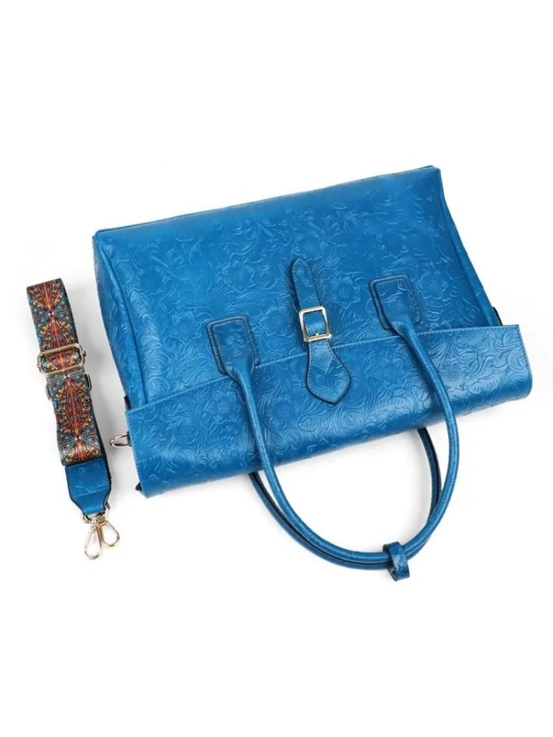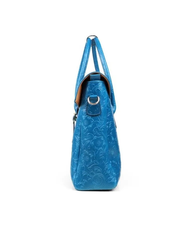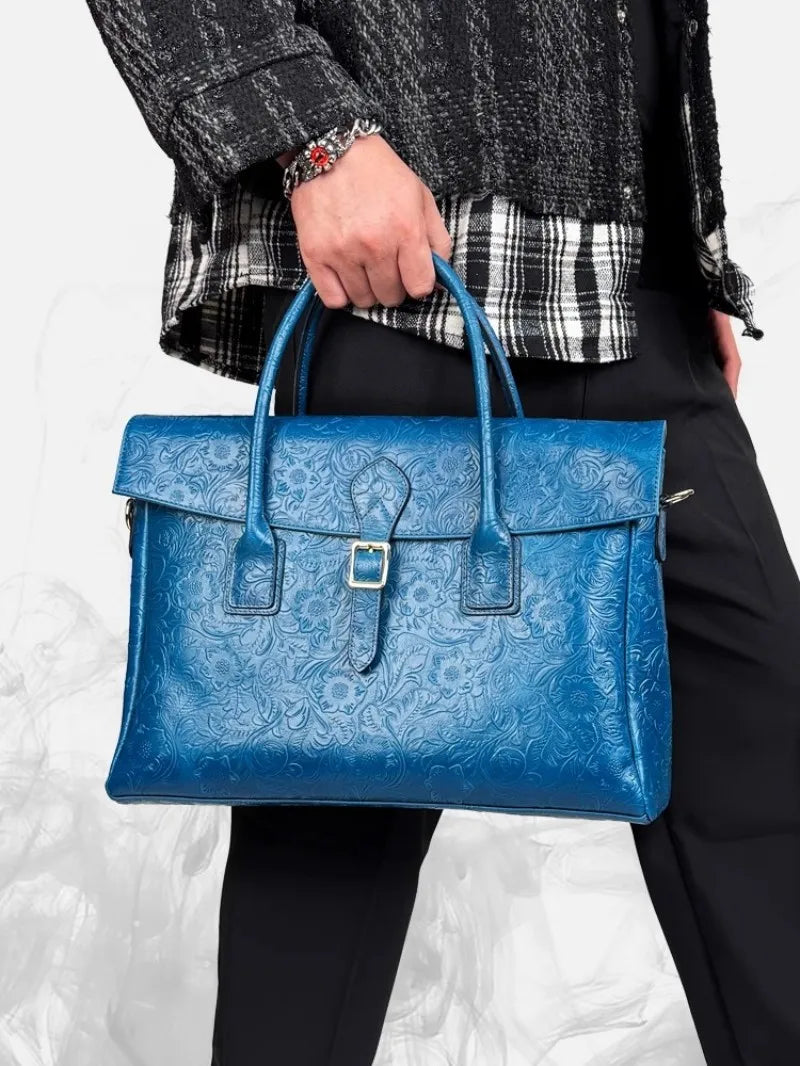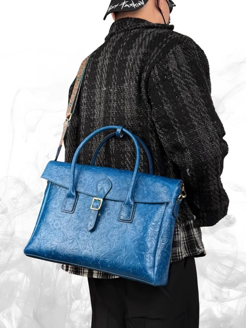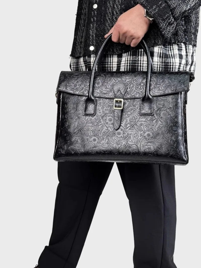 Vintage flower carved leather bag single shoulder briefcase & business satchel