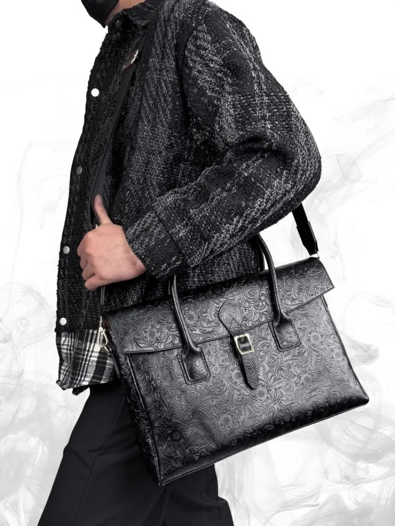 The LITTLE BLACK COW vintage satchel is a bold expression of craftsmanship, combining the strength of premium genuine leather with the elegance of floral embossing. Designed for the modern man who values both function and form, this structured bag transitions effortlessly from business to casual occasions.