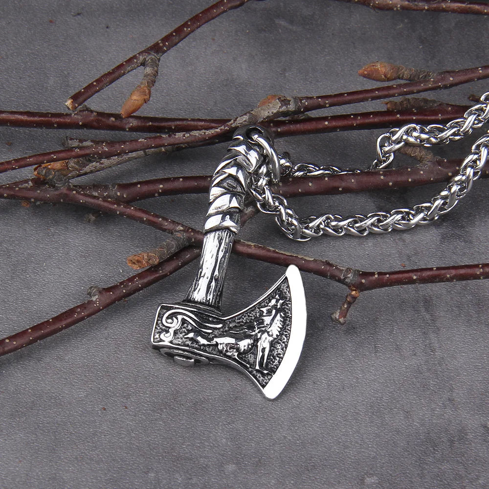 Design: Ethnic-style pendant featuring Viking Odin axe with wolf and raven totems