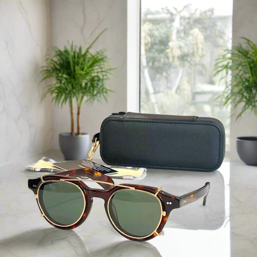 This model fuses heritage craftsmanship with functional style, offering both prescription frame use and instant sun protection thanks to the clip-on option. A must-have for lovers of retro fashion, quality eyewear, and standout design.